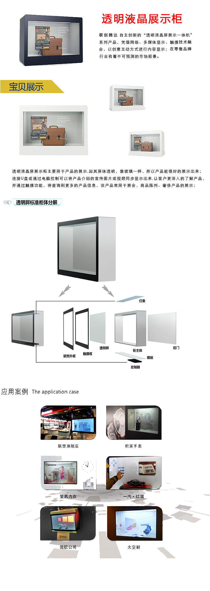 透明显示 不可抗拒的真实之美 常用尺寸:22寸、26寸、32寸、42寸、47寸、55寸、70寸、82寸 产品概述: 1、专业结构设计,美观大方,全新透明液晶面板,彰显细腻逼真的显示效果 2、透明液晶其独特的透明显示技术是当前世界潮流技术,透过率达到65% 3、透明液晶与背光源分开设计,使其影像与实体之间达到3D效果,互动更具体验感 4、可利用普通的环境光满足背光需求,比传统液晶现实屏降低90%电力消耗,更加环保 5、可通过遥控开关控制,实现透明显示与正常显示的随意切换 •更具创意,更具科技元素。可称之为新一代智能数字标牌 6、人性化的精巧电源和高清解码能力及完善的商用功能,是商用的首选产品 7、应用场合:楼宇、商场、酒店、机场、车站、邮局、银行、医院、4S店、展会、卡拉 OK 、餐厅等场所